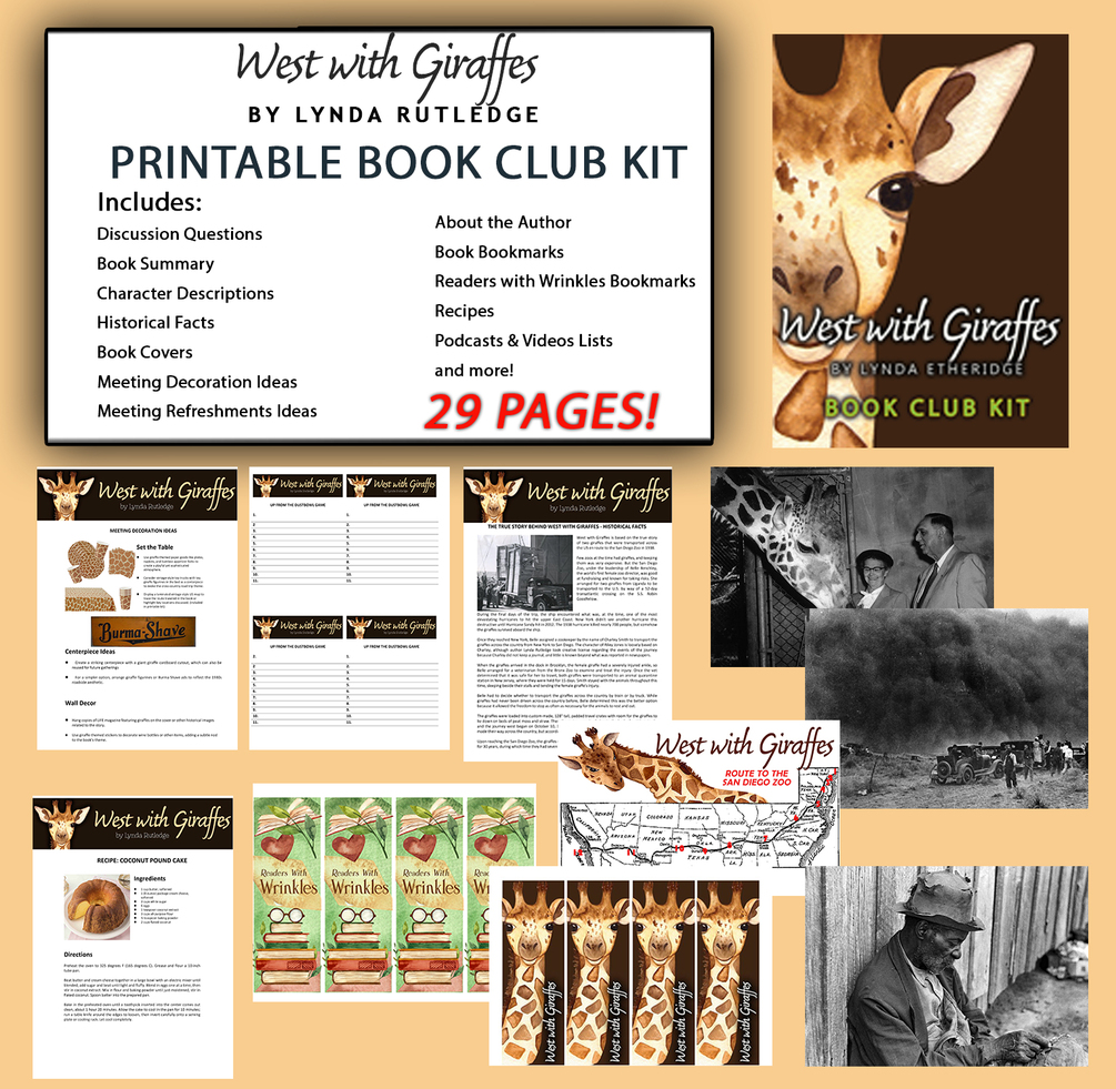Step into the extraordinary journey of West with Giraffes by Lynda Rutledge—a historical novel inspired by true events, following a Depression-era cross-country road trip with two giraffes, a seasoned zookeeper, and a desperate orphan. This book club kit is designed to elevate your club’s experience, spark meaningful discussion, and immerse your group in the world of Woody Nickel and his unforgettable companions.